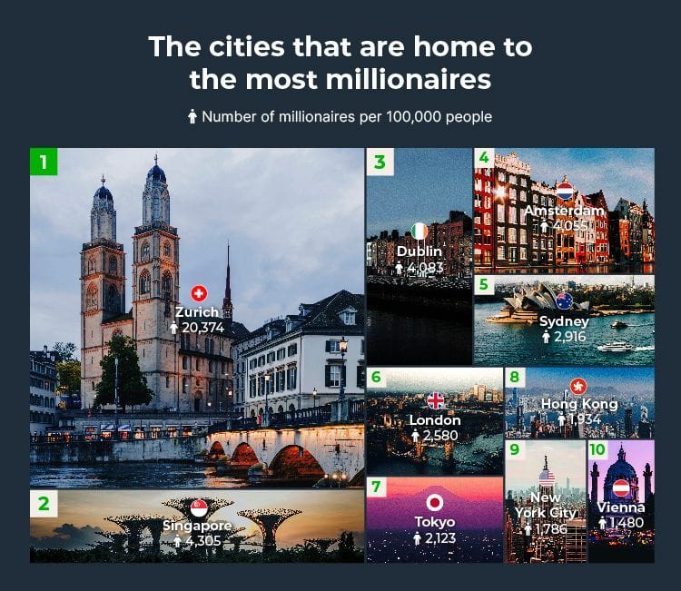 In 2024, Zurich stands out as the city with the highest concentration of millionaires in the world. Singapore and Dublin follow in second and third place respectively. This hierarchy is based on Zurich’s high salaries and advantageous working conditions, which make it possible to reach millionaire status more quickly.